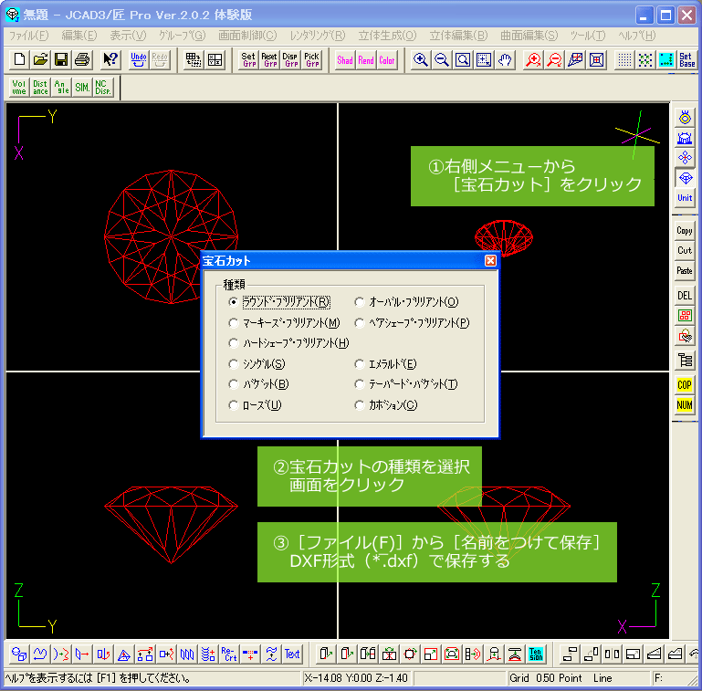 宝石の各種カッティングがすでにプリセットされているので、JCAD3上でプリミティブ形状を作成、DXFファイルに書き出せば宝石形状をShadeにインポートできます。